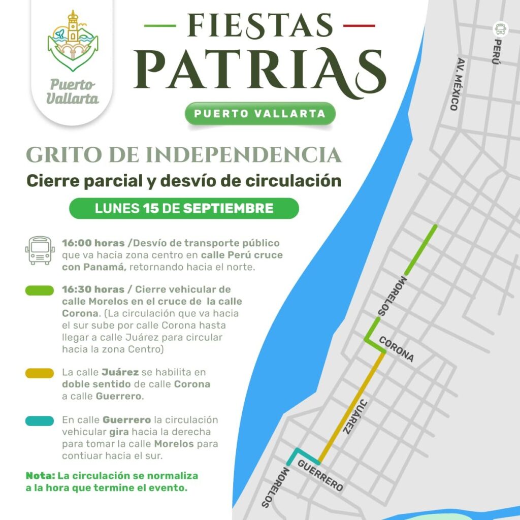 Con motivo del desfile por el CCXV Aniversario del inicio de la independencia mexicana, la dirección de Seguridad Pública y Vialidad municipal de Puerto Vallarta, informó que se implementará un operativo vial en el centro de la ciudad, así como cambios a la circulación en algunas calles de la zona a partir de las 05:00 de la tarde de este lunes 15.