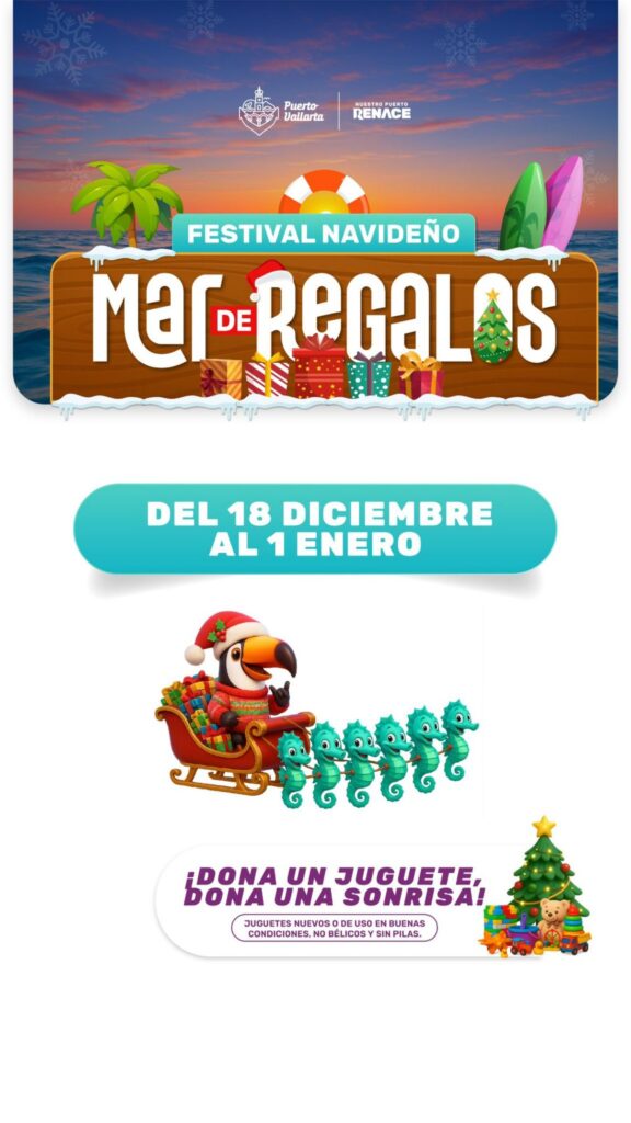 El Gobierno de Luis Munguía se complace en invitar a todos los vallartenses y visitantes al Festival Navideño «Mar de Regalos», que se celebrará del 18 de diciembre al 1 de enero. Este evento es una excelente oportunidad para que las familias se reúnan y disfruten de un ambiente festivo repleto de sorpresas.