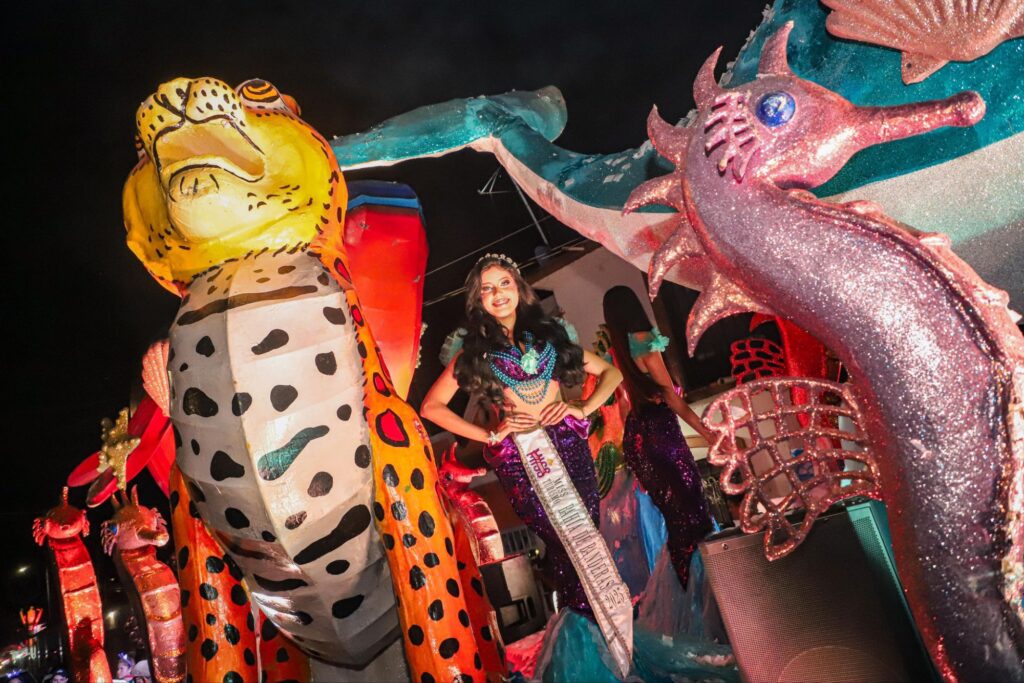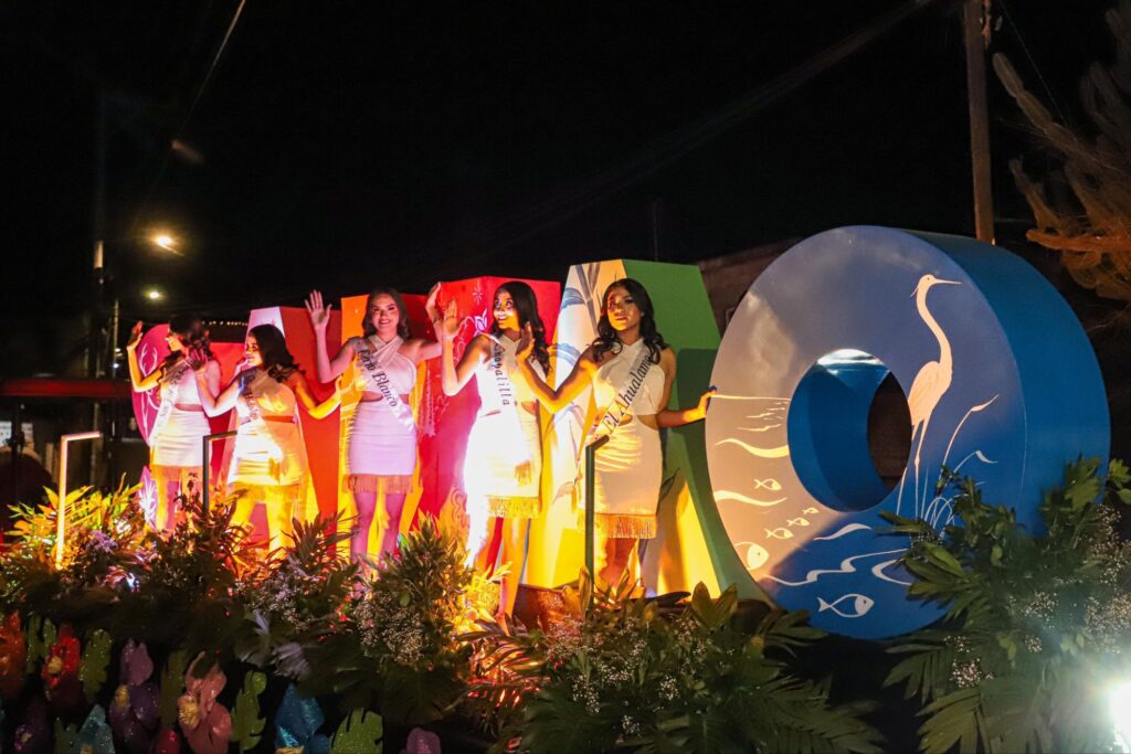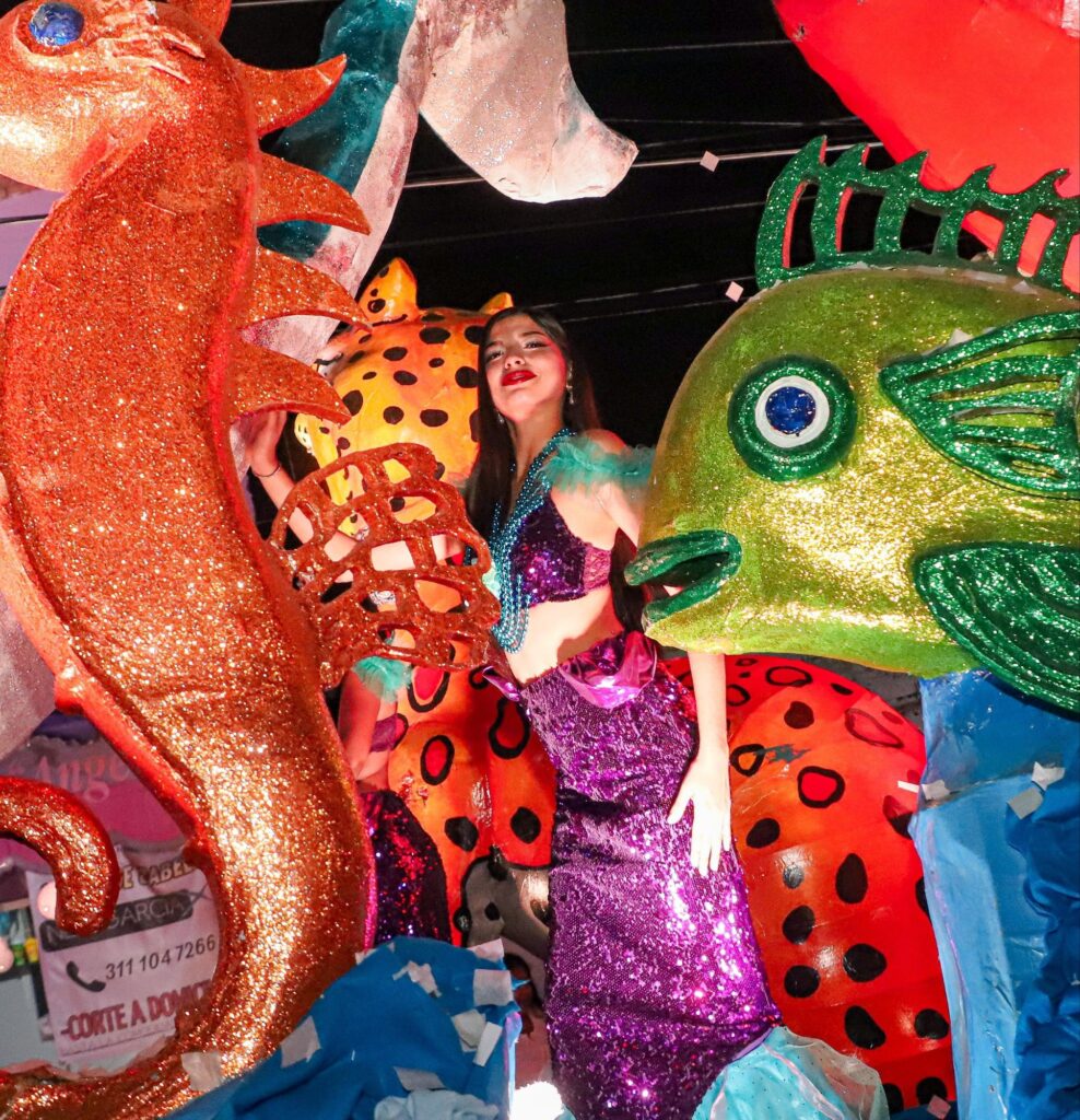 Detrás de la comparsa desfiló un imponente carro alegórico decorado con figuras representativas de la flora y la fauna del municipio, en el cual viajaba la reina de Bahía de Banderas, Keyla Arreola, quien saludó con entusiasmo a las familias de Santa María del Oro.