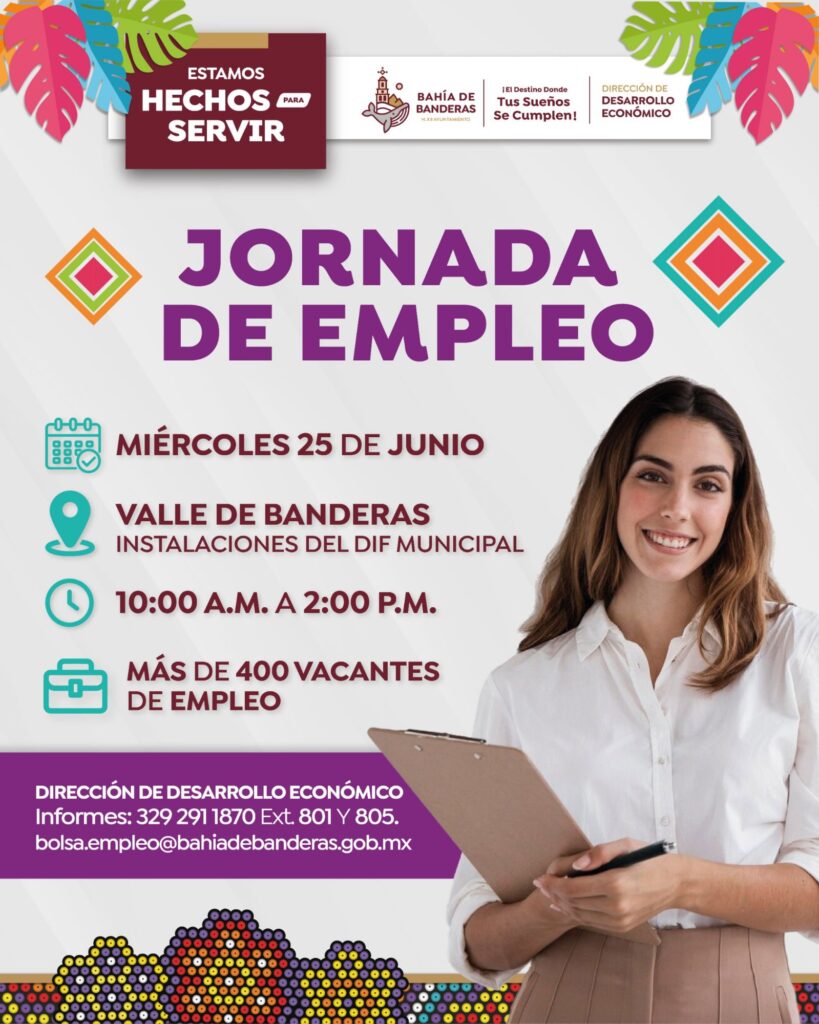 Como parte del compromiso del gobierno municipal de acercar oportunidades de desarrollo a la ciudadanía, la Dirección de Desarrollo Económico de Bahía de Banderas realizará este miércoles 25 de junio, una Jornada de Empleo en las instalaciones del DIF Municipal, ubicadas en Valle de Banderas.