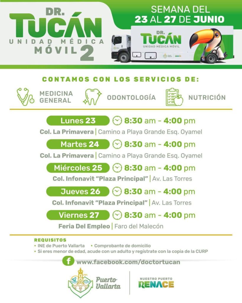 El programa de atención médica gratuita que ofrece el gobierno de Puerto Vallarta a través de las Unidades Médicas Móviles «Dr. Tucán» es una excelente iniciativa para facilitar el acceso a servicios de salud. Entre el 23 y el 27 de junio, estas unidades estarán disponibles en diferentes colonias, brindando consultas de medicina general, odontología, nutrición, y más.