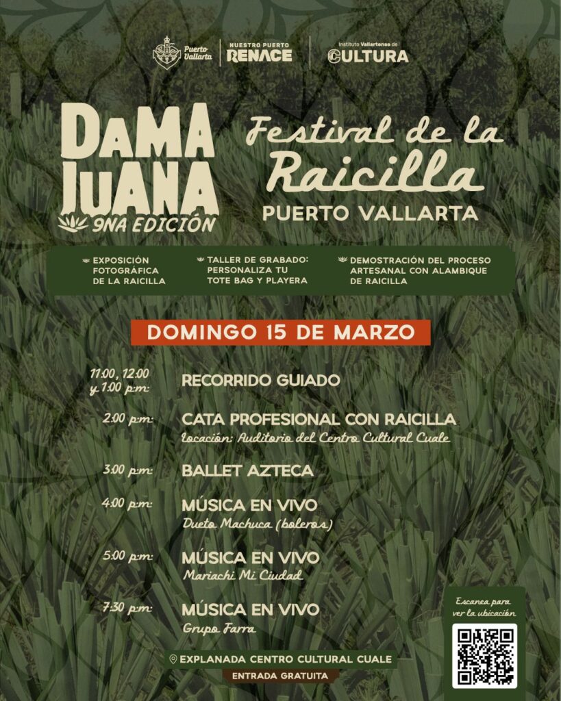 Del 13 al 15 de marzo, la explanada del Centro Cultural Cuale será el escenario del 9º Festival de la Raicilla Dama Juana, un evento que celebra la tradición, la música, las catas y los productores de raicilla de diversas regiones de Jalisco. Este festival, impulsado por el gobierno del arquitecto Luis Ernesto Munguía González a través del Instituto Vallartense de Cultura, ofrecerá entrada gratuita para toda la familia.